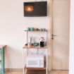 It consists of an open space with kitchen and living room, bathroom with shower and a double bedroom with third bed.